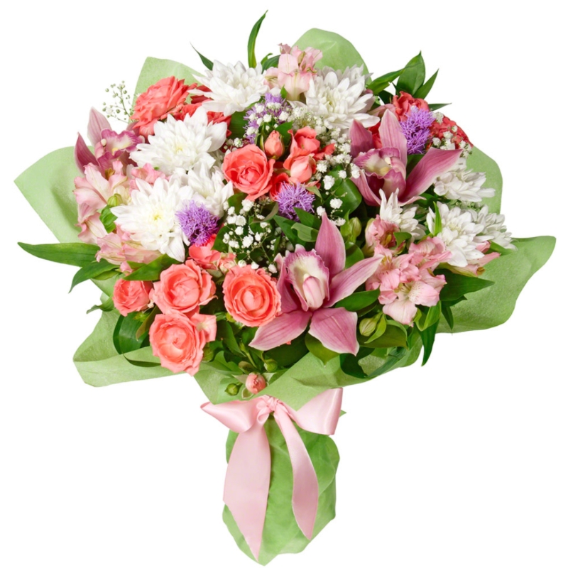 Букет состоит из 3 орхидеи, 3 альстромерии, 4 ветки кустовой розы, 3 ветки хризантемы, 2 гипсофила, зелень, упаковка, лента.