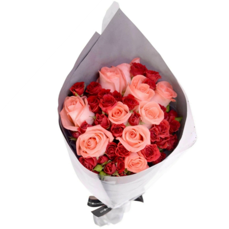 Букет состоит из 11 коралловых роз, 6 веток красных роз, красивая упаковка, атласная лента.