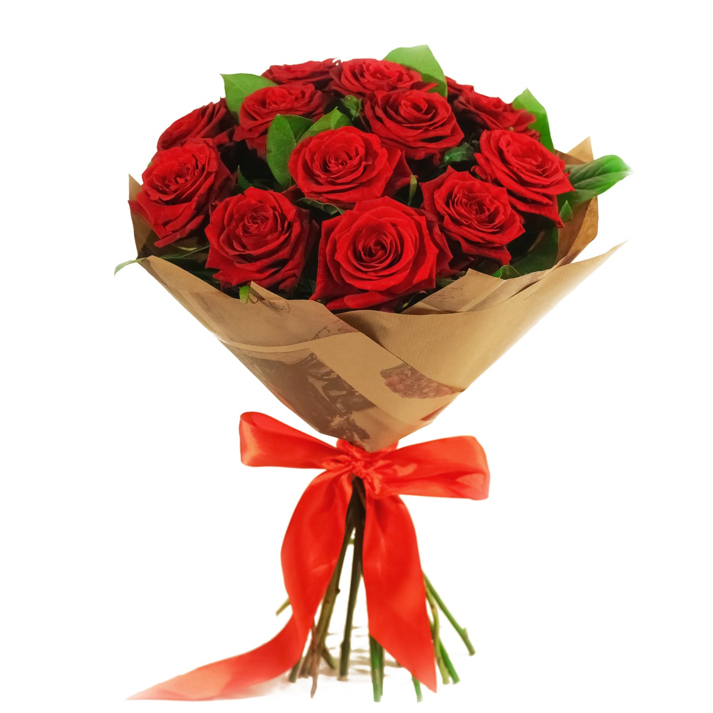 Букет состоит из 17 красных роз, крафт, атласная лента.