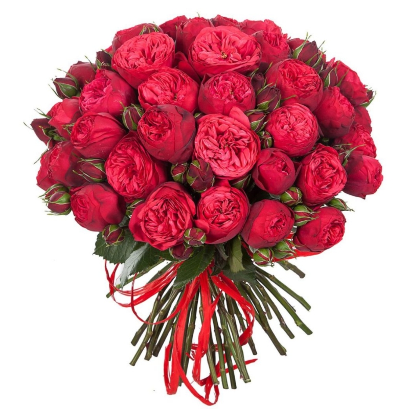 Букет состоит из 31 ветка роз Red Piano, прозрачная упаковка, атласная лента.