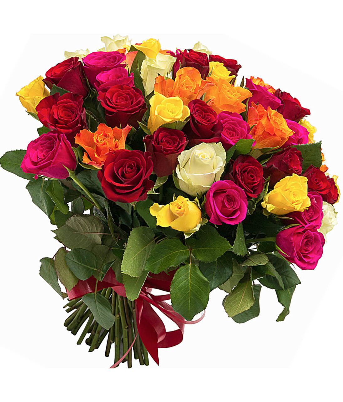 Букет состоит из MIX из 51 розы, прозрачная упаковка, атласная лента.